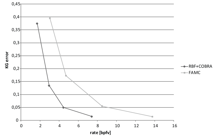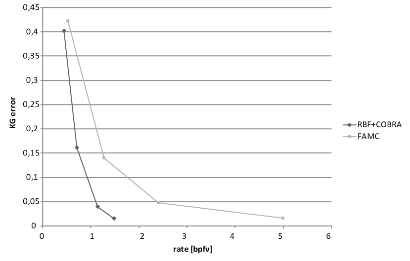 AchievementsWe have based our efforts on the main idea of viewing the input data as a set of vertex trajectories, which must be transmitted from the encoder to the decoder. We have decided to first analyze the whole set of trajectories using the Principal Component Analysis (PCA). This analysis gives us a new basis for the space of trajectories. Each vertex is subsequently expressed in this new basis, while most of the coordinates in the new coordinate system may be neglected. This way, we achieve a 70-90% reduction of the dimensionality of the data, without losing more than one percent of the original variance of the data. Subsequently, we use parallelogram prediction of the vertex data (i.e. PCA coefficients describing the trajectory of each vertex). This way we achieve a great reduction of the entropy of residuals. Finally, we quantize the residuals and transmit these to the decoder. This basic idea has been published in the paper CoDDyAC: Connectivity Driven Dynamic Mesh Compression. In our following work, we have extended the algorithm by including a simplification step. Simplification by vertex decimation is performed simultaneously by encoder and decoder after transmitting connectivity data, before transmitting geometry data. The geometry data are transmitted in inverse decimation order, i.e. vertices are added into fully known neighborhoods. This process allows replacing the original extrapolation (parallelogram prediction) by interpolation, which is more precise and more robust, and therefore provides residuals of lower entropy. Moreover, the inclusion of simplification yields a scalable data stream, i.e. the decoder can stop receiving the data during the transmission and display a rough (not fully reconstructed) version of the data to the user. The enhancement by simplification is described in detail in the paper Combined Compression and Simplification of Dynamic 3D Meshes. We have developed an advanced prediction scheme for the interpolation. The scheme is based on radial basis functions (RBF), and allows a higher precision prediction, which leads to about 25% reduction of the data rate. This approach is currently under development and has not been published yet. We have also noticed that since the combination coefficients for the PCA can be well predicted, it is the PCA basis which takes a significant part of the compressed data stream. Knowing that the PCA basis is orthonormal, we have exploited the fact that the importance (number of times repeated in the output animation) of the basis trajectories is highly variable. Our algorithm introduces smaller quantization error to important basis trajectories and larger quantization error to less important ones. Additionally, each basis vector can be interpreted as a vertex trajectory, which we may assume to be smooth. This assumption allows using motion-based prediction of the values. Using the mentioned techniques we were able to reduce the size of the encoded basis by about 90%. These results are described in the paper COBRA: Compression of the Basis for PCA Represented Animations. Currently we are also focusing on the problem of evaluation of the dynamic mesh compression algorithms. We have found that the currently used metrics for measuring distortion caused by lossy compression (such as MSE or DA error) are unreliable and do not correlate with human perception of distortion. Motivated by this insufficiency, we have conducted a series of subjective tests, and proposed a new metric (STED error) which provides a much better correlation with the results of subjective testing (we have obtained the Pearson correlation coefficients of about 0.95). The results of subjective testing and the proposed error metric are currently only described in the Ph.D. thesis of Libor Váša. ResultsWe are presenting rate-distortion curves for two of the testing models. The rate is expressed in bits per frame per vertex, the error is computed according to Karni and Gotsman. We are comparing our algorithm (RBF + Cobra) against the current state of the art algorithm FAMC (which is now a part of the MPEG standard). Dance model